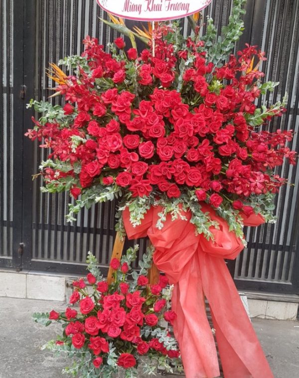 - Hoa bao gồm: Hoa lan mokara đỏ, hoa hồng, giấy nơ trang trí cao cấp, thủy trúc, lá bạc…..