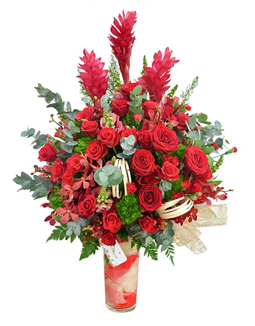 Bình Hoa Thiết Kế Sự Nghiệp Thành Công – Hoa Hồng Rednaomi, Hoa Hồng đỏ, Cẩm Chướng đỏ, Hoa Hạnh Phúc, Green Wicky